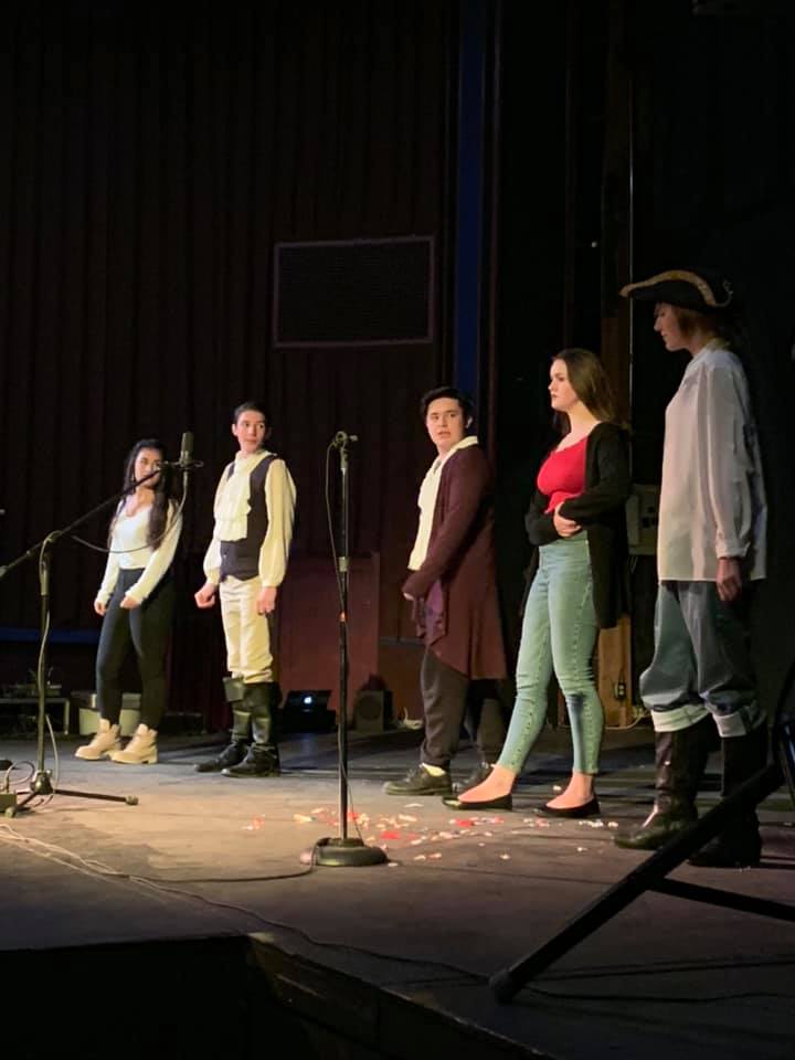 They came from all over the county: Portola, Indian Valley, Quincy, Sattley–5 different schools. A couple of kids from each school. Shy kids. Kids never having been on stage before. Kids who didn’t know whether they could sing or not. We roped one of their principals into it and asked him to sing Right Hand Man as George Washington. We got the women who usually sing and act with us to sing a song or two. We created a costume contest. A kid made trivia quiz. A challenge to write a Ben Franklin wrap. We got the local theatre to rent us a kid friendly space. And we rehearsed them on two sides of the county a couple times a week since after Thanksgiving.